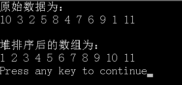 /* 堆:堆是一棵完全二叉树; //堆是完全二叉树,完全二叉树不一定是堆; 分类:大根堆 根比左右子树大; 小根堆 根比左右子树小; 堆排序:(升序为例) 1.数据集合的存储:将数据集合存储为完全二叉树; 2.将end指向最后一个结点,pa指向最后一个双亲结点, 双亲分别于左右子树交换,比左子树大不变,反之交换,之后比较右子树, 最后pa--; 3.直到比较到root,root此时为最大,将此时的root与end交换,砍掉end, 将end--指向最后一个结点,直到end指向root根结点; */ #include<stdio.h> #define N 11 void HeapSort(int a[]) { int end=N-1; //end指向最后一个元素; while(end!=0) //end到根结点结束 { while(1) { int pa=end/2-1; //指向最后一个双亲结点; //printf("%d %d %d\n",a[pa],a[2*pa],a[2*pa+1]); int tag=0; //判断是否还需要进行第二步; //将最大值移至下标为1的位置; while(pa>=0) //进行一次pa从最后一个双亲结点到第一个; { if(a[pa]<a[2*pa+1]) //双亲与其左孩子比较; { tag=1; int temp=a[pa]; a[pa]=a[2*pa+1]; a[2*pa+1]=temp; } //2*pa+1<=end,防止越界; if((2*pa+1<=end) && a[pa]<a[2*pa+2]) //双亲与其右孩子比较; { tag=1; int temp=a[pa]; a[pa]=a[2*pa+2]; a[2*pa+2]=temp; } pa--; //进行--操作,移向上一个双亲; } if(tag==0) //说明这次循环没有进行交换,说明已经找到的最大值; { //将最大值放在数组的最后一位,之后的次大值一次放这个位置的前一个位置; int t=a[0]; a[0]=a[end]; a[end]=t;//将这次找到的最大值放置在a[end]; break; } } end--; //end前移,用来放置下一个循环的最大值; } printf("堆排序后的数组为:\n"); for(int i=0;i<N;i++) printf("%d ",a[i]); printf("\n"); } int main(void) { int a[N]={10,3,2,5,8,4,7,6,9,1,11}; printf("原始数据为:\n"); for(int i=0;i<N;i++) printf("%d ",a[i]); printf("\n\n"); HeapSort(a); return 0; }