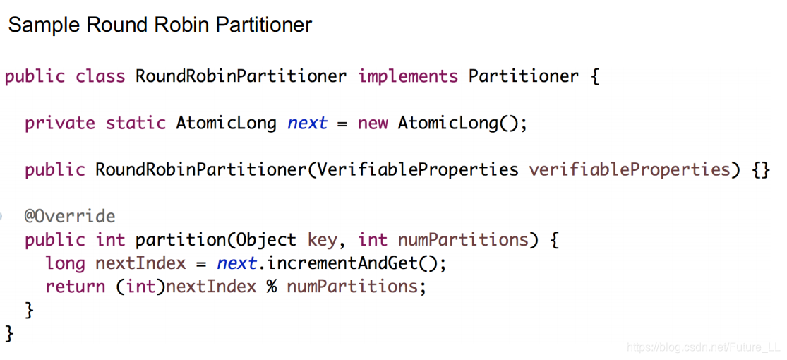 - 第二种是轮询的方式,第一次进来是partition 0,第二次就partition 1,第三次是partition 2,第四次是partition 0,一次类推
