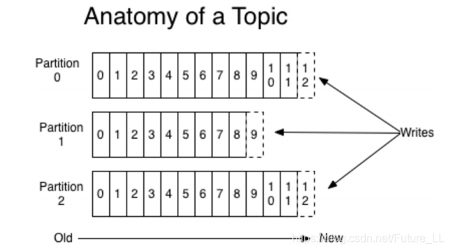 - kafka里面的消息是有topic来组织的,简单的我们可以想象为一个队列,一个队列就是一个topic,然后它把每个topic又分为很多个partition,这个是为了做并行的,在每个partition里面是有序的,相当于有序的队列,其中每个消息都有个序号,比如0到12,从前面读往后面写