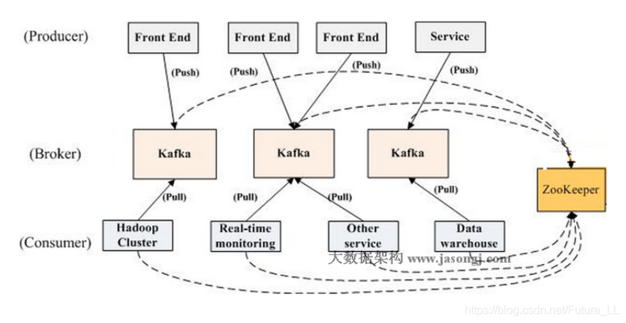 - ZooKeeper:协调Kafka Broker,存储原数据:consumer的offset+broker信息+topic信息+partition个信息。
