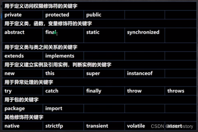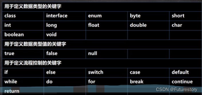关键字:被java余元赋予了特殊含义,用作专门用的的字符串(单词),所有字母都为小写