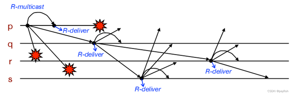 p进程崩溃导致消息到不了r、s进程,但是q进程通过B-multicast将消息发送到了r、s进程
