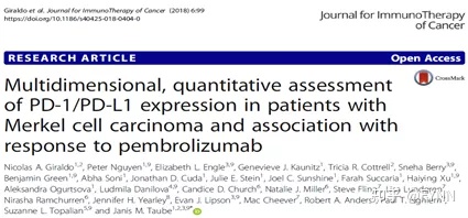 2018年发表在《Journal for ImmunoTherapy of Cancer》杂志上(IF:9.913)的文章“Multidimensional, quantitative assessment of PD-1/PD-L1 expression in patients with Merkel cell carcinoma and association with response to pembrolizumab”(图1),利用免疫组织化学/免疫荧光(IHC / IF)对预处理的FFPE肿瘤标本进行染色,然后利用HALO强大的数字图像分析功能,发现MCC患者中PD-1+ 和 PD-L1+细胞的密度以及它们之间的相互作用与临床反应相关,为预测生物标记物提供了新思路。