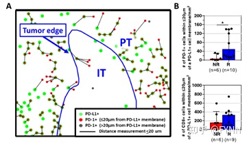 图4 邻近PD-L1+细胞的PD-1+细胞密度与pembrolizumab的临床反应相关