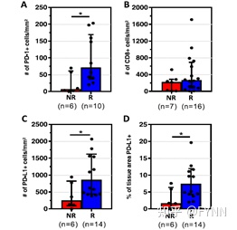 图3 PD-1+和PD-L1+细胞密度与Pembrolizumab的临床反应相关