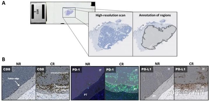 首先病理学家对肿瘤边界进行了注释,并将其包围的区域称为肿瘤内部(IT)。癌旁(PT)区域位于肿瘤边界外100μm处,均由HALO进行标注(图2)。将每平方毫米中显示CD8(棕色)、PD-1(绿色)、PD-L1(棕色)或NKp46的阳性细胞数作为IT、PT或TME (PT+IT)区域的连续变量进行评估。发现Pembrolizumab治疗无缓解组(NR)和完全缓解组(CR)各类细胞分布存在差异(图2B)。