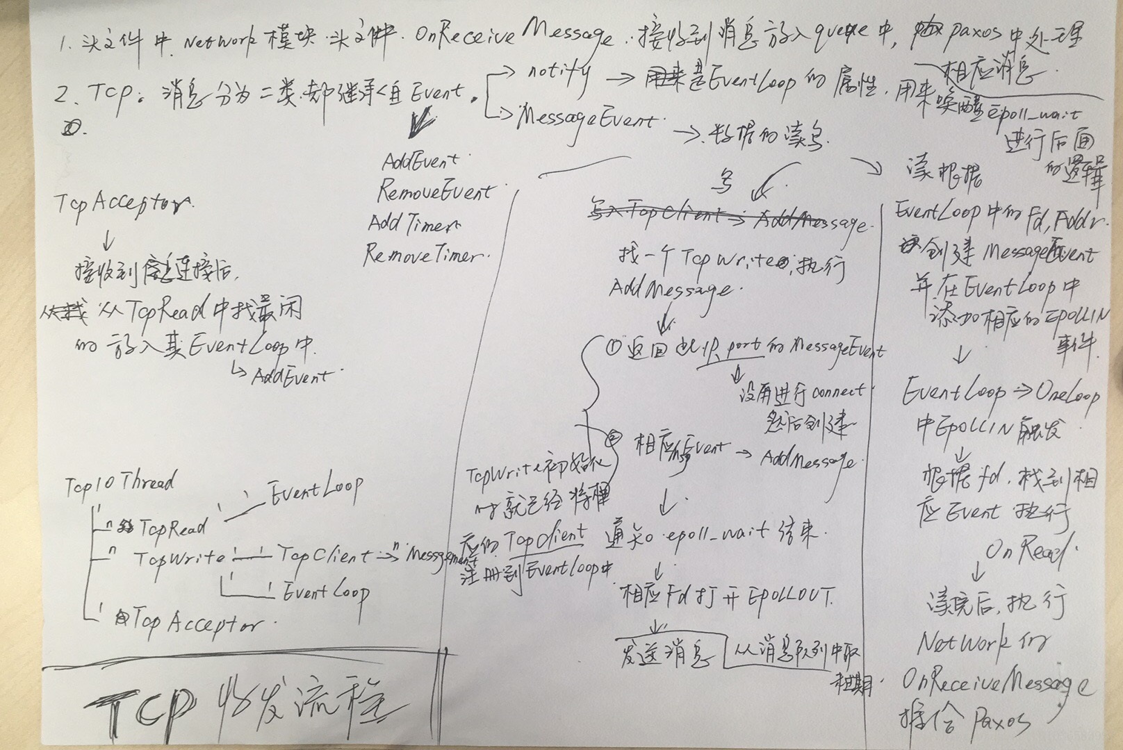 整个的处理逻辑被封装在TcpIOThread中进行处理,TcpIOThread包含一个TcpAcceptor,多个TcpRead,多个TcpWrite。然后每一个TcpRead对应一个EventLoop,TcpWrite对应一个TcpClient和一个EventLoop.TcpClient中含有MessageEvent.大约是这么一个关系。下面是一个我手画的类关系图,凑活着看吧