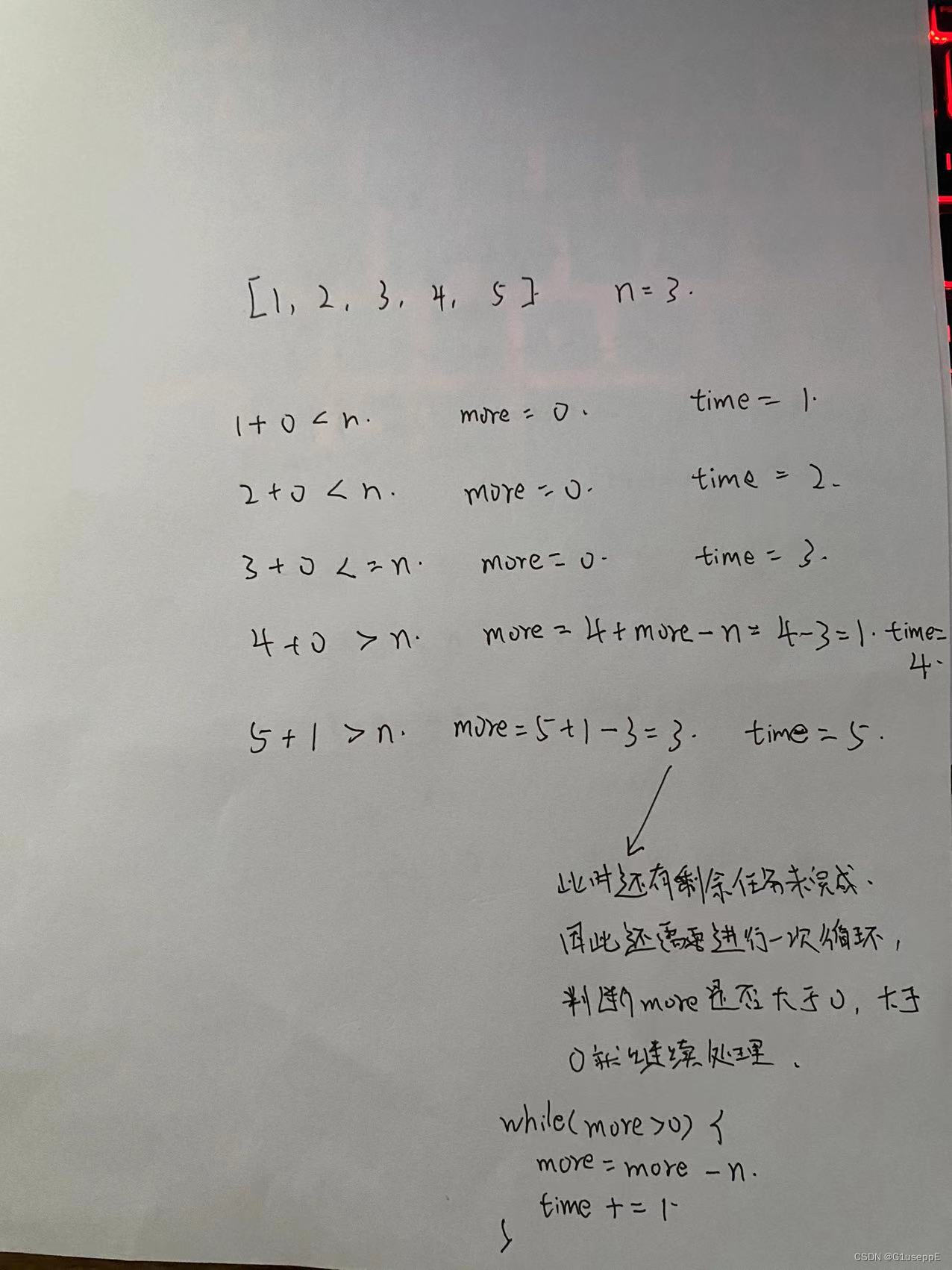 另外一点就是即使当前组的任务数低于GPU一次能处理的任务数,也应该只处理当前任务组的任务,任务组就是理解为每一个数组元素,不提前进入下一任务组处理下一任务组的任务,题目是说GPU最多一次执行n个任务,个人理解为可以一次最多处理n,也可以处理不到n的任务数。