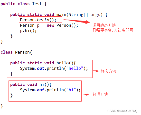 - 静态方法可以直接调用静态方法,但是调用普通方法只能通过对象的实例才能调用。