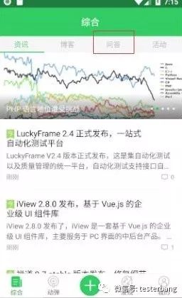 接着来介绍下按文本的定位方式,这是一种最快捷的定位方式,如果是不考虑后期维护下的话,如果控件刚好有文本的属性,按文本定位是最快的,都不需要用到元素查看的工具uiautomatorviewer就可以直接定位了。Appium并没有直接提供按文本定位的方法但可以通过其他定位方式来进行构造,假如想定位首页的问答页,如下图所示: