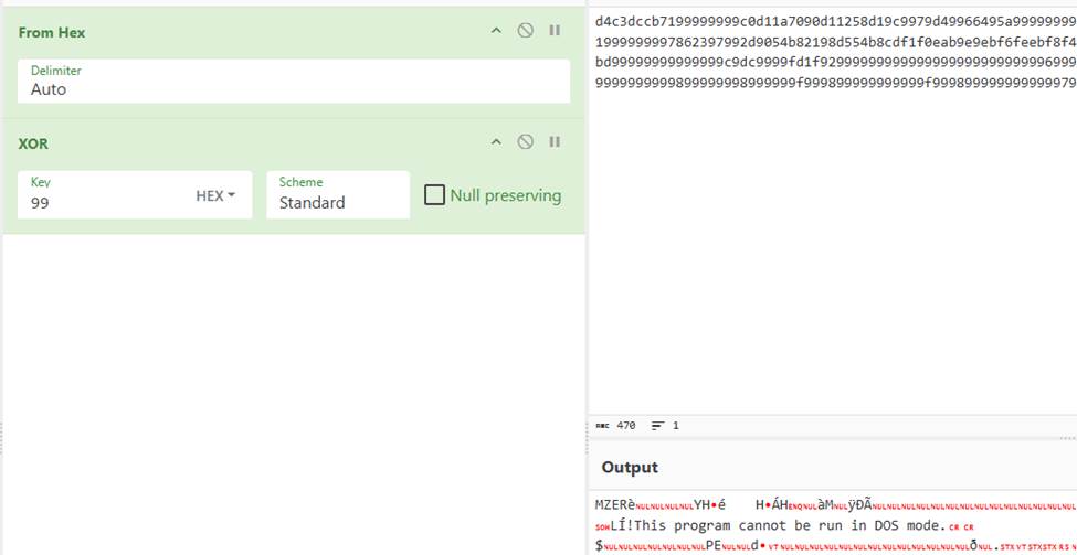 样本首先向服务器发送请求以获取远控阶段载荷,上传信息为“w64+服务器IP”,猜测该信息含义是请求服务器下发64位windows版本木马,远控地址为指定IP的远控样本。服务器下发的载荷进行了简单的异或加密,异或密钥为“0x99”,解密后的载荷为PE文件。