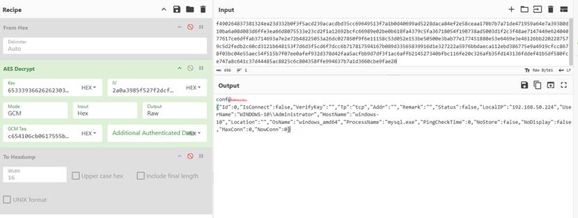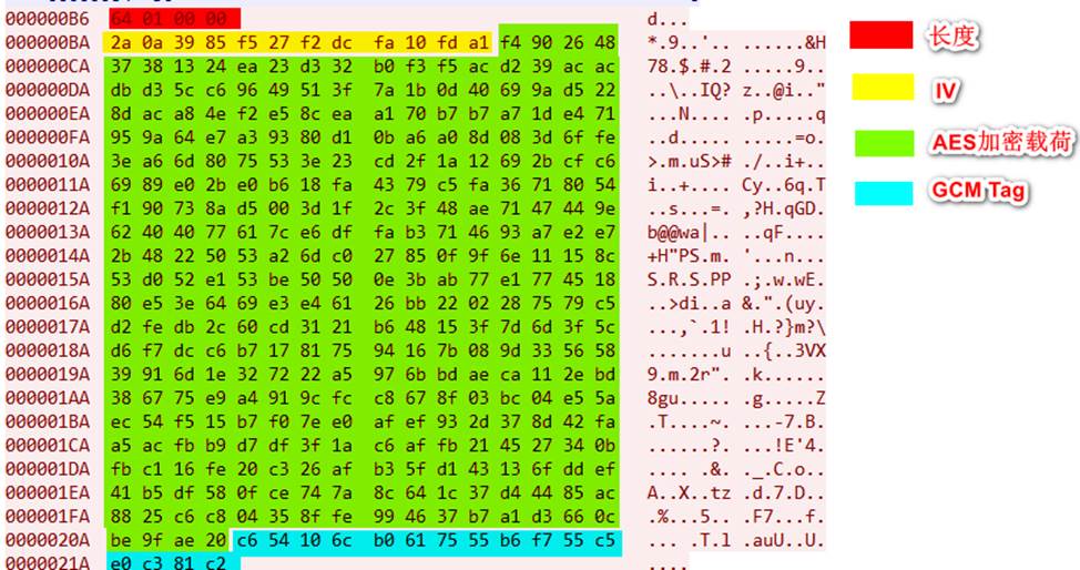 第二阶段为远控产生的加密通信流量,通信载荷使用了AES_256_GCM加密方式加密,加密使用的IV随着流量传输,加密使用的KEY“|6533393662626230353335323964326464623137623130306161303464376335|”硬编码记录在样本中。样本使用AES_256_GCM加密方式,与传统的加密方式相比,GCM 是一种集成了加密与认证功能的高级加密模式,在加密数据的同时,能够生成一个认证标签(Tag),用于验证数据的完整性与真实性,防止通信内容被篡改或伪造,从而为恶意流量的隐藏和抗分析提供了更强保障。