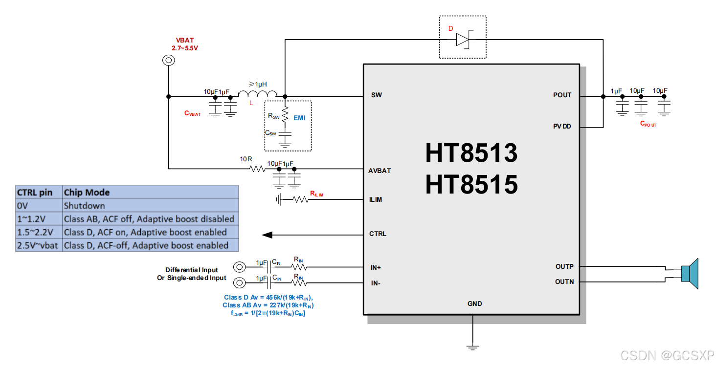 ● HT8513,HT8515的最大特点是防削顶失真(ACF)输出控制功能,可检测并抑制由于输入音乐、语音信号幅度过大所引起的输出信号削顶失真(破音),也能自适应地防止在BOOST升压电压下降所造成的输出削顶,显著提高音质,创造非常舒适的听音享受,并保护扬声器免受过载损坏。