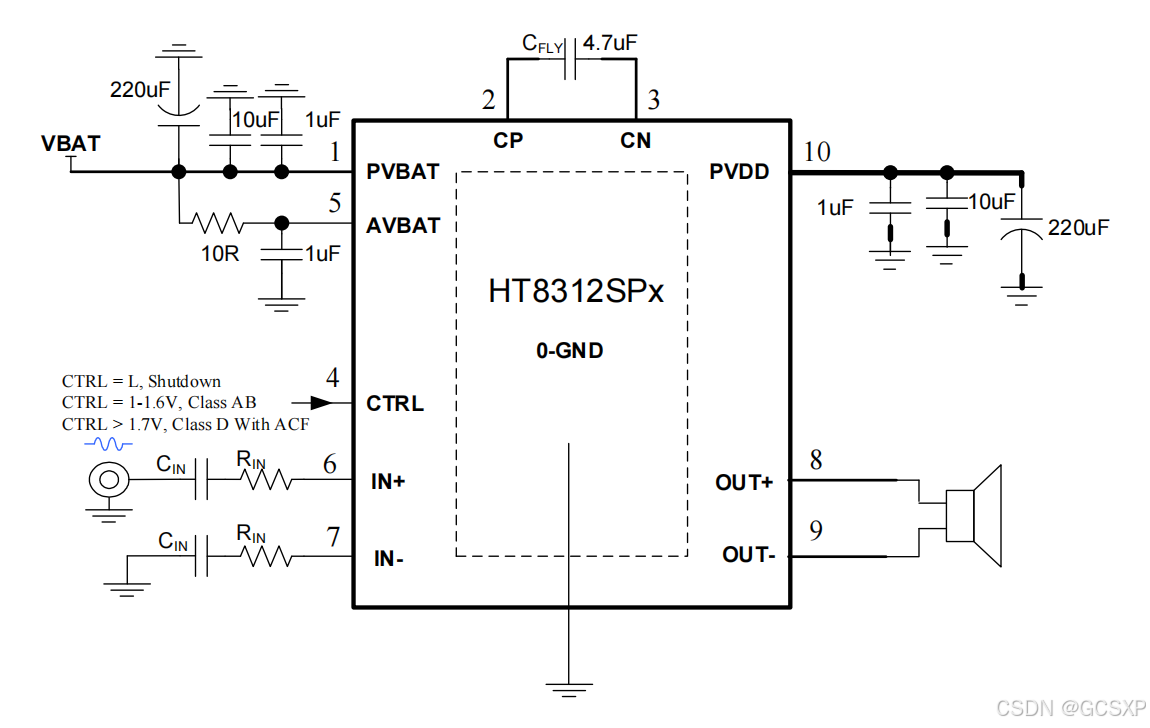 ● HT8312是一款D类音频功率放大器,在VBAT=4.2V、THD+N=10%,4Ω负载条件下能连续输出5.2W功率。该D类功放的电源电压由内置的自适应电荷泵升压模块提供。该升压模块在低功率时不升压,可有效提升电池的播放时间。