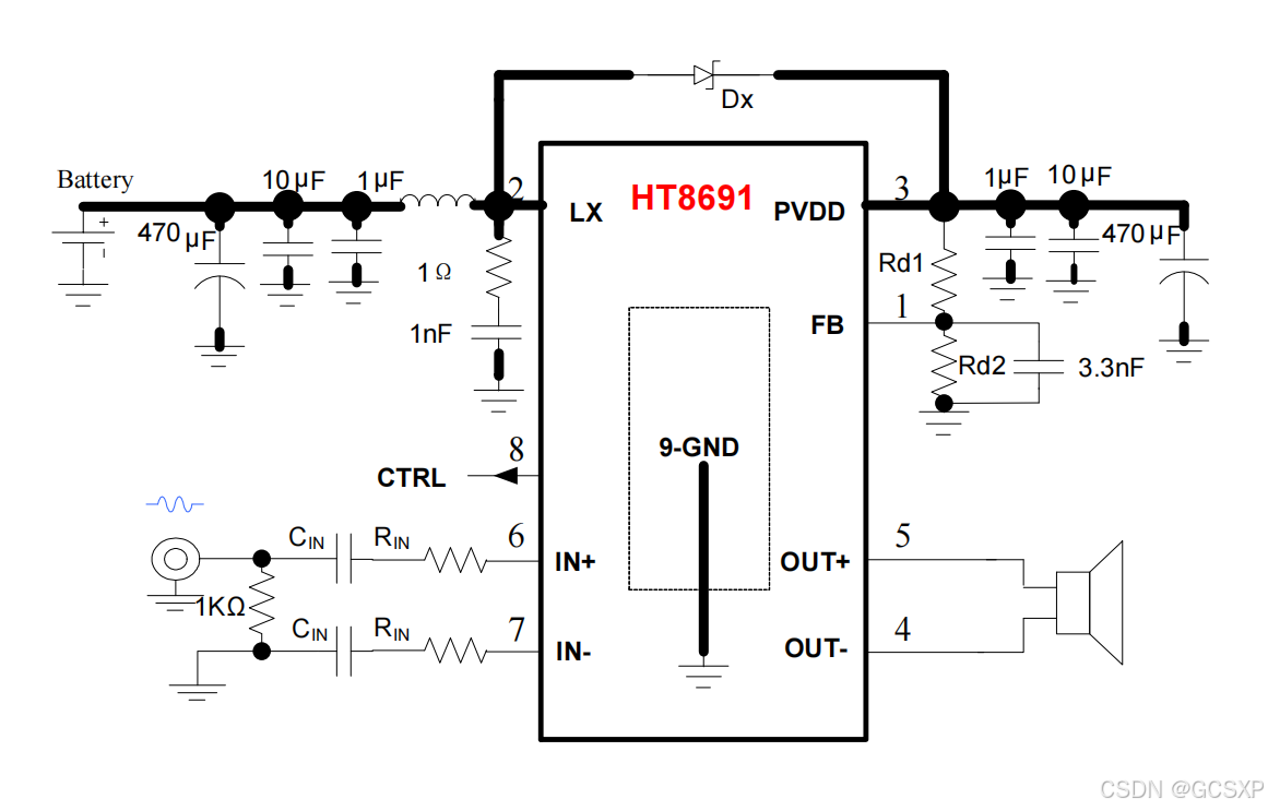 ● 此外,HT8691内置的关断功能使待机电流最小化,还集成了输出端过流保护、片内过温保护和电源欠压异常保护等功能。