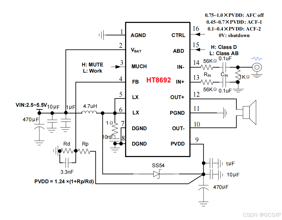 ● HT8692的最大特点是防削顶失真(ACF)输出控制功能,可检测并抑制由于输入音乐、语音信号幅度过大所引起的输出信号削顶失真(破音),也能自适应地防止在BOOST升压电压下降所造成的输出削顶,显著提高音质,创造非常舒适的听音享受,并保护扬声器免受过载损坏。同时芯片具有ACF-Off 模式。