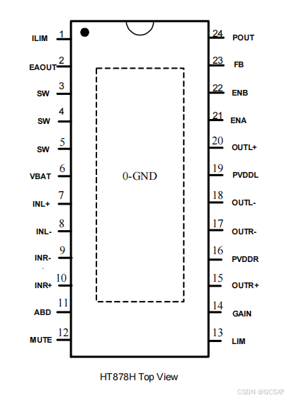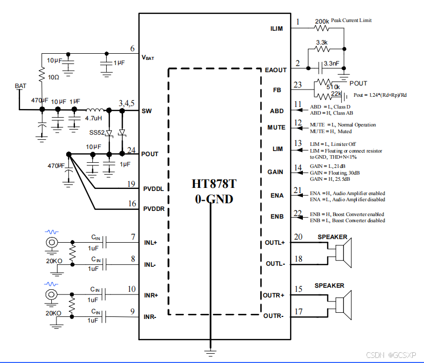 ● HT878T是一款内置自适应升压的立体声D类音频功率放大器,由锂电池供电升压至VpouT=8.3V时,THD+N=1%、1kHz信号条件下,能连续输出2x6.8W功率(4Ω负载);另外,其还支持AB类模式。