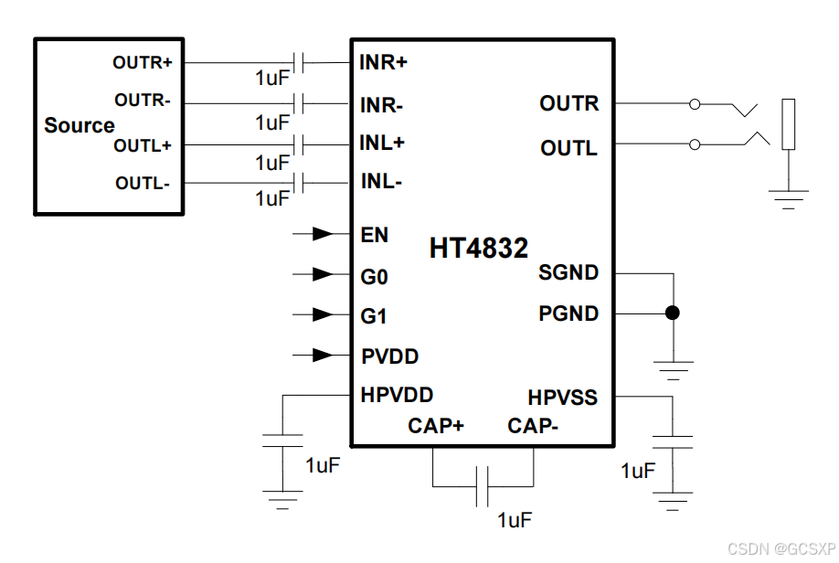 ● HT4832在3.6V供电下,THD+N=1%,32ohm负载时能提供33mW的输出。其具有低至0.014%的THD+N。