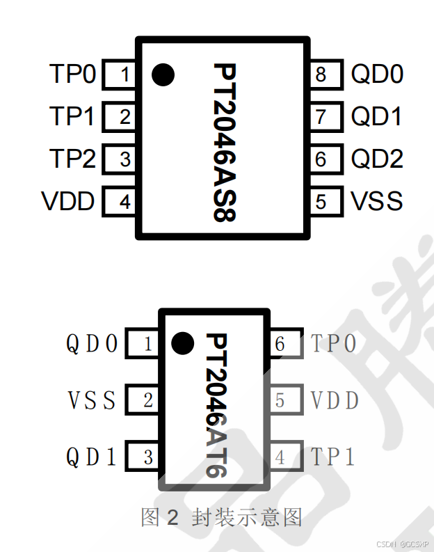 ● PT2046A 是一款3键触摸检测芯片。该芯片内建稳压电路,提供稳定电压给触摸感应电路使用,同时内部集成高效完善的触摸检测算法,使得芯片具有稳定的触摸检测效果。该芯片专为取代传统按键而设计,具有宽工作电压与低功耗的特性,主要应用于电子称等消费类电子产品。