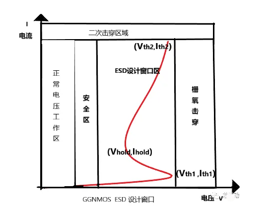 (示意图 1:包含正常工作电压区、安全区、ESD 设计窗口区、栅氧击穿区、二次击穿区,标注 Vth1、Vth2、Vhold 等关键参数)