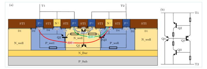 某研究所提出的 PNP_DDSCR 器件,通过嵌入横向 PNP 晶体管优化 ESD 设计窗口。与传统 DDSCR 相比,其触发电压降低 31%,维持电压提高 16.8%,设计窗口优化 44.5%。在 VF-TLP 测试中,过冲电压仅为传统器件的 37%,同时保持快速触发速度。该结构的创新为窄窗口下的高电流泄放提供了新思路。