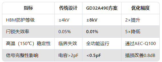 合规芯片需满足 AEC-Q100可靠性标准,其中ESD防护是核心指标之一。该公司某系列 MCU 采用 24nm 工艺,通过双级 TVS 二极管结构和 0.5μm 间距的保护环设计,在 150℃引擎舱环境下实现 ±8kV HBM 防护。量产数据显示,闩锁失效比例从 0.05% 降至 0.01%。该案例表明,在先进工艺中,全芯片协同设计(如电源轨与 I/O 端口的防护网络)是应对窄窗口挑战的关键。