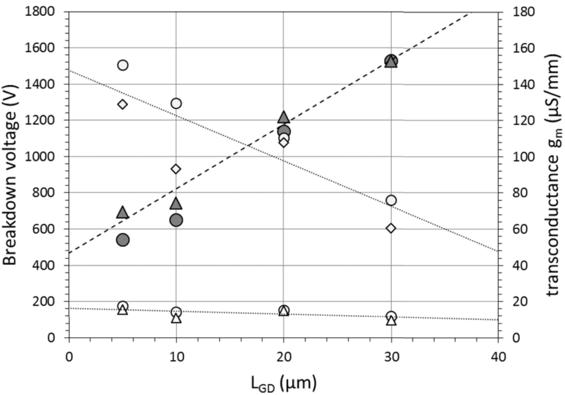 图2.金刚石MESFET的击穿电压和跨导随栅极-漏极长度(L GD)的变化关系,