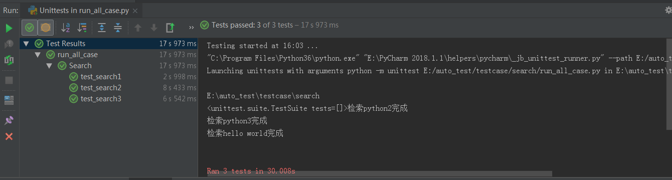 这样运行run_case.py,就只执行了在百度中搜索python3这条用例,手动添加指定用例到测试套件的方法是addTest(),但是很多时候我们写了很多测试脚本文件,每个脚本中有多个test,,如果还是使用addTest()方法就不行了,我们希望能获取所有的测试集,并全部执行。然后编辑run_all_case.py文件,编写如下代码: