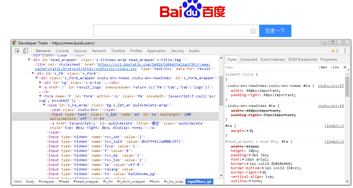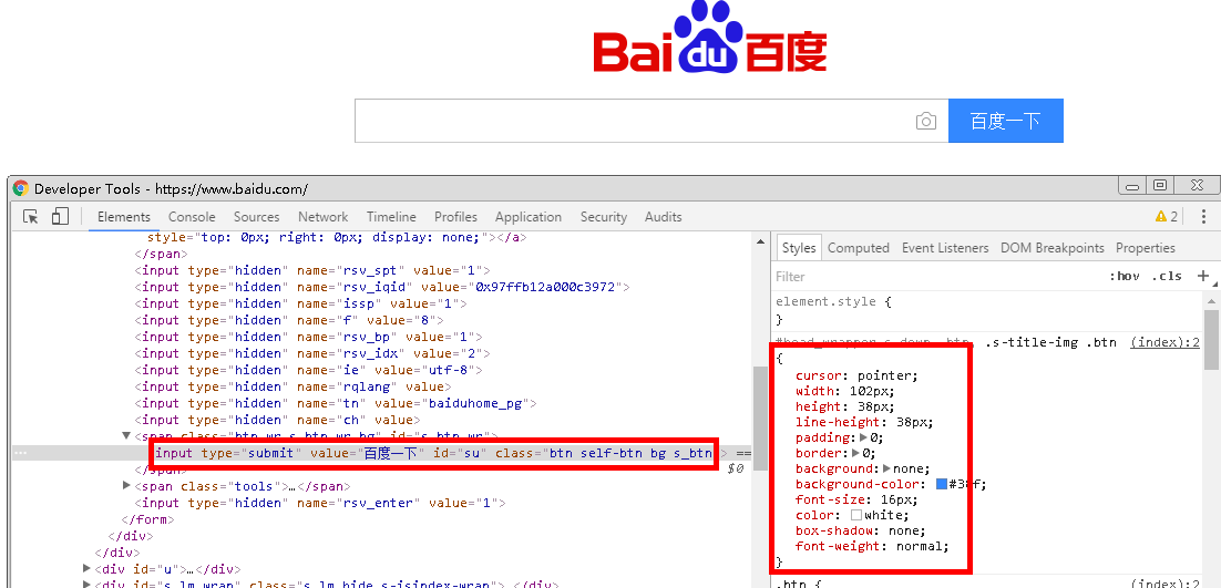 CSS:全称Cascading Style Sheets,即层叠样式表。CSS用来确定网页页面的排版样式的标准,指定了网页中文字的大小、颜色、位置等属性。如下图定位到【百度一下】这个按钮,查看样式: