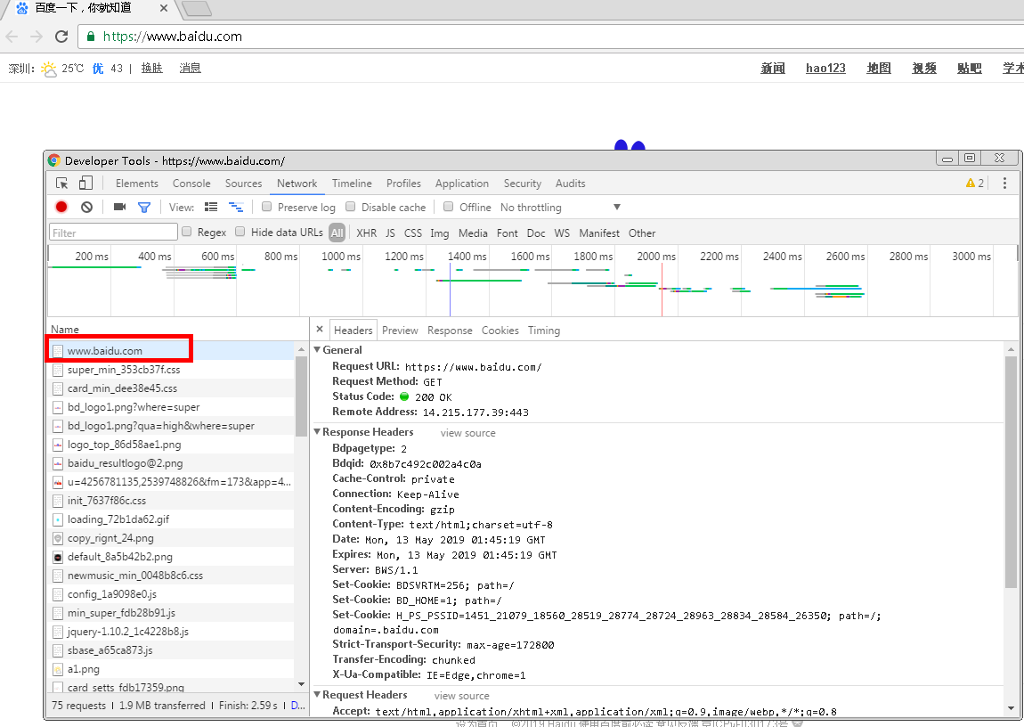 其中第一条网络请求:www.baidu.com,就是浏览器向百度服务器发送的一条请求访问百度站点的请求,点击这个请求,即可看到请求的详细信息和内容。