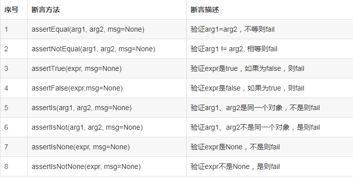 无论是什么样的测试用例,最后都需要有用例执行后的验证,在接口自动化测试中我们执行完接口用例也需要验证断言用例执行是否满足我们的预期。unittest提供了丰富的断言方法,常见的断言如下表: