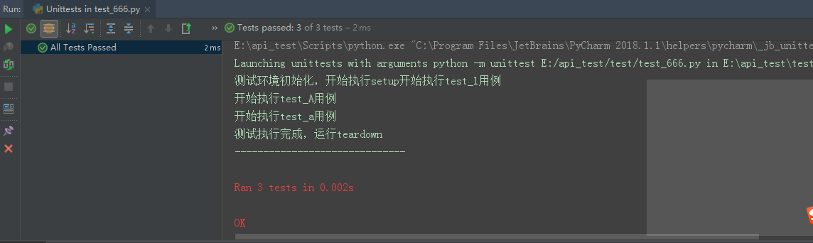 可以看到所有用例都执行完后,setUpClass()和tearDownClass()只运行了一次。因此在编写一个测试脚本时,里面写了多个测试用例,