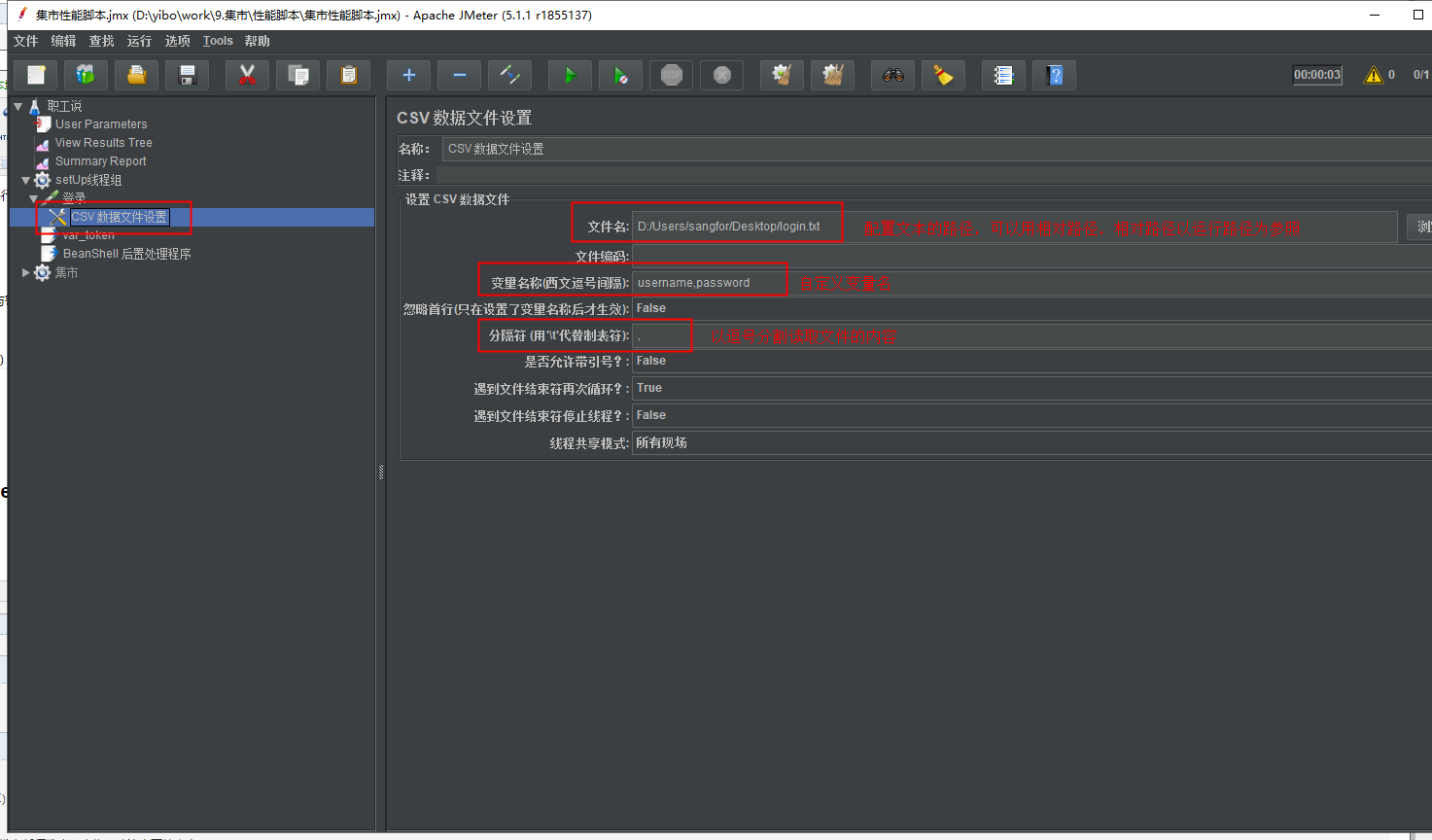 CSV Data Set Config 可以从指定的文件中一行一行的提取文本内容,每行的数据通过分隔符拆解,并与变量名一一对应,就可以供取样器引用了。