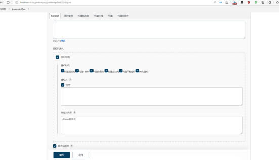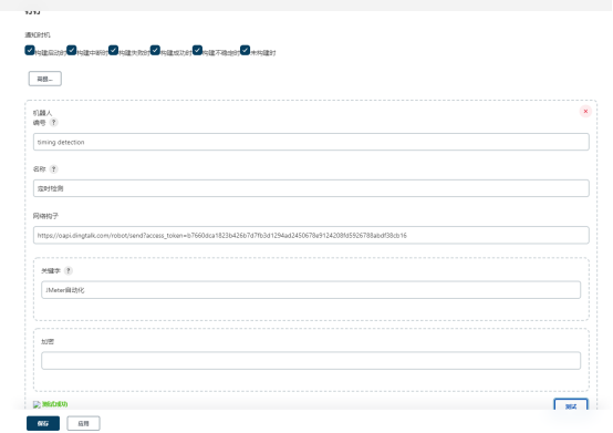 在Configure System中找到机器人选项,并且复制webhook到网络钩子,然后添加机器人的编号、名称和关键词,然后点击测试,如果显示测试成功则表示配置成功,最后保存