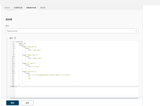 选择高级选项中,选择流水线定义中的pipeline scrip,然后添加脚本