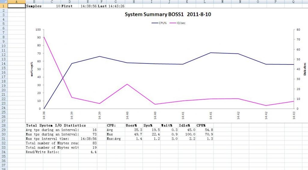 | SYS_SUMM | 系统汇总,蓝线为cpu占有率变化情况,粉线为磁盘IO的变化情况; |