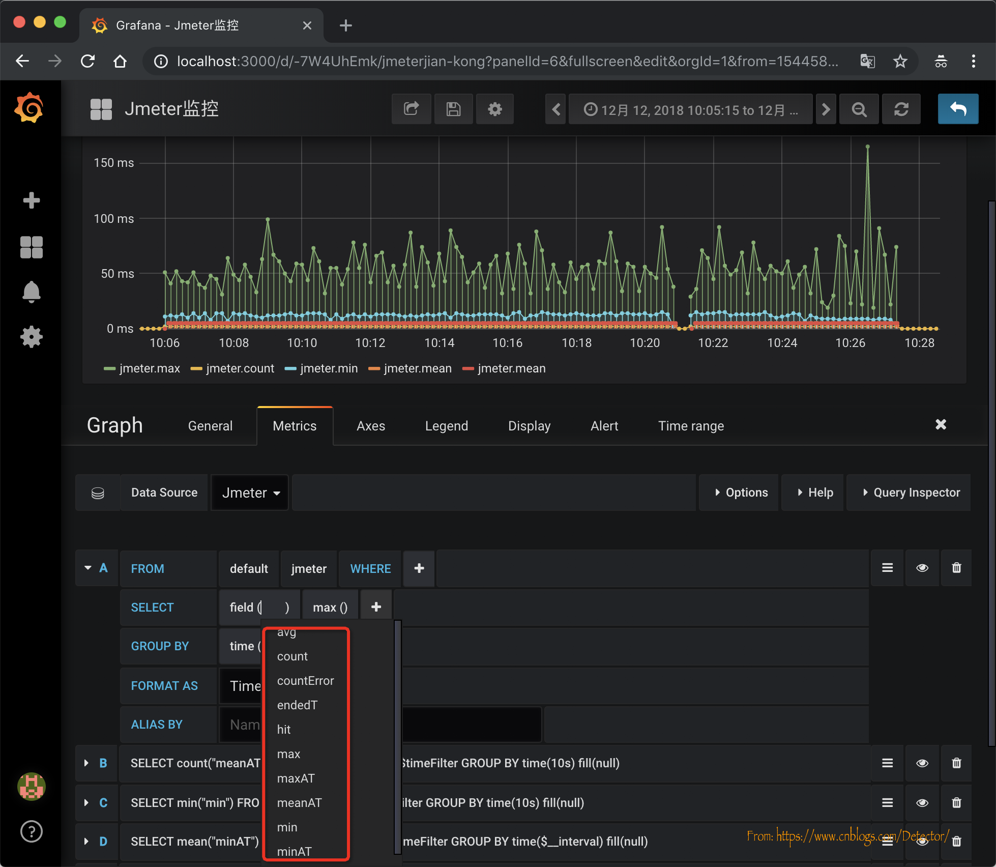 下图是我简单选择的几个维度生成的监控图像,红框标出的是可以选择的各种指标,还有一部分没有罗列出来,可以根据实际情况进行选择: