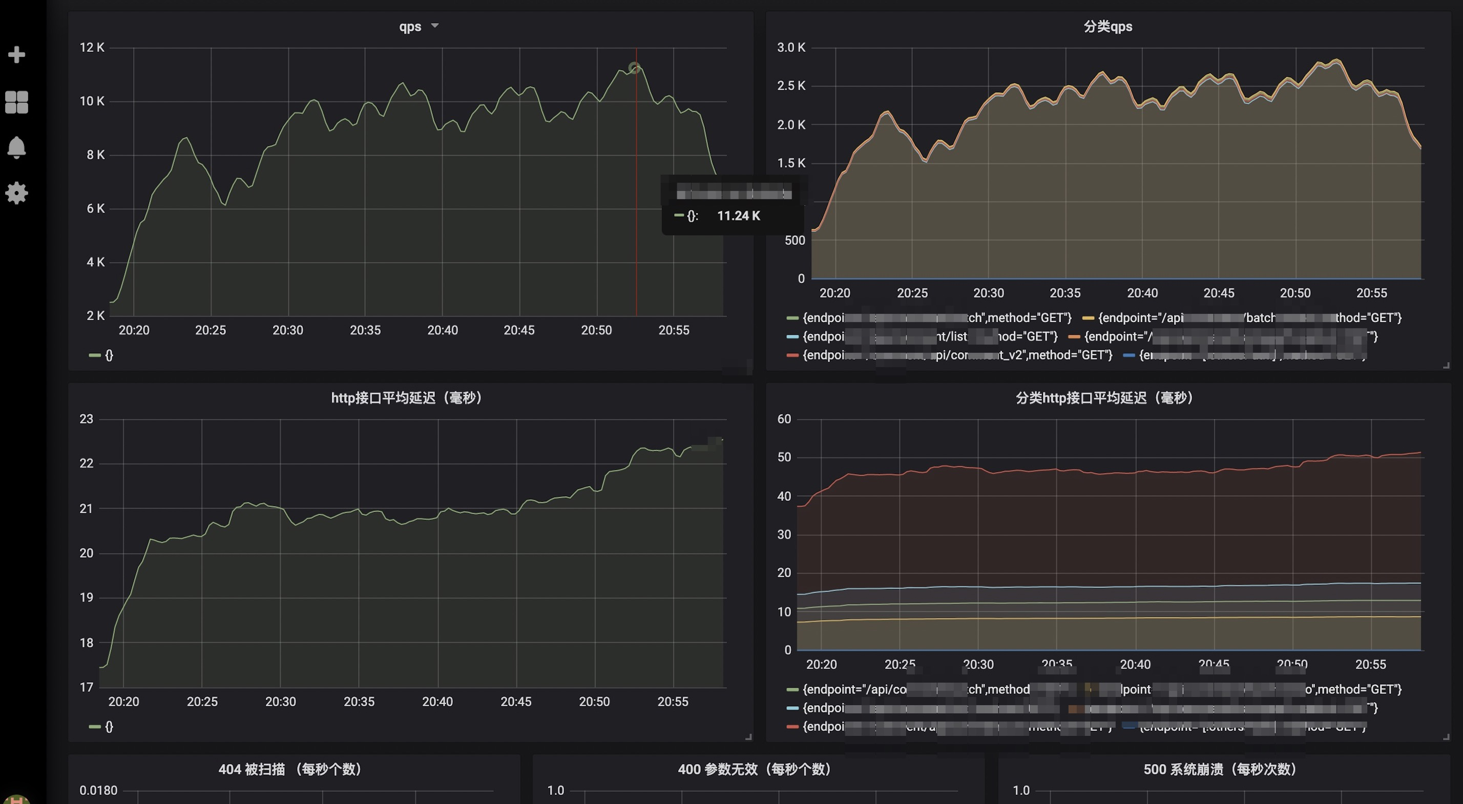 首先我们来看一下最后的成品,监控了TPS、并发、请求成功率、失败率、请求&接收数据大小、平均响应时长、95%的请求平均响应时长等等。(这里面的各个板块都是可自定义配置的,无论多花里花哨都可以[奸笑脸])