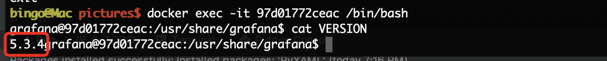 也可以执行docker exec -it container-id /bin/bash进入容器内部查看信息,比如我们拉取的grafana镜像的grafana版本是5.3.4。