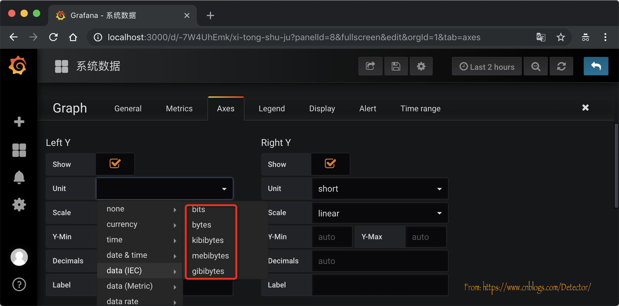在配置界面Axes选项卡中配置相关的显示单位。可以根据实际的情况选择监控的单位。,因为我们监控的内存,所以选择的是相关的单位。