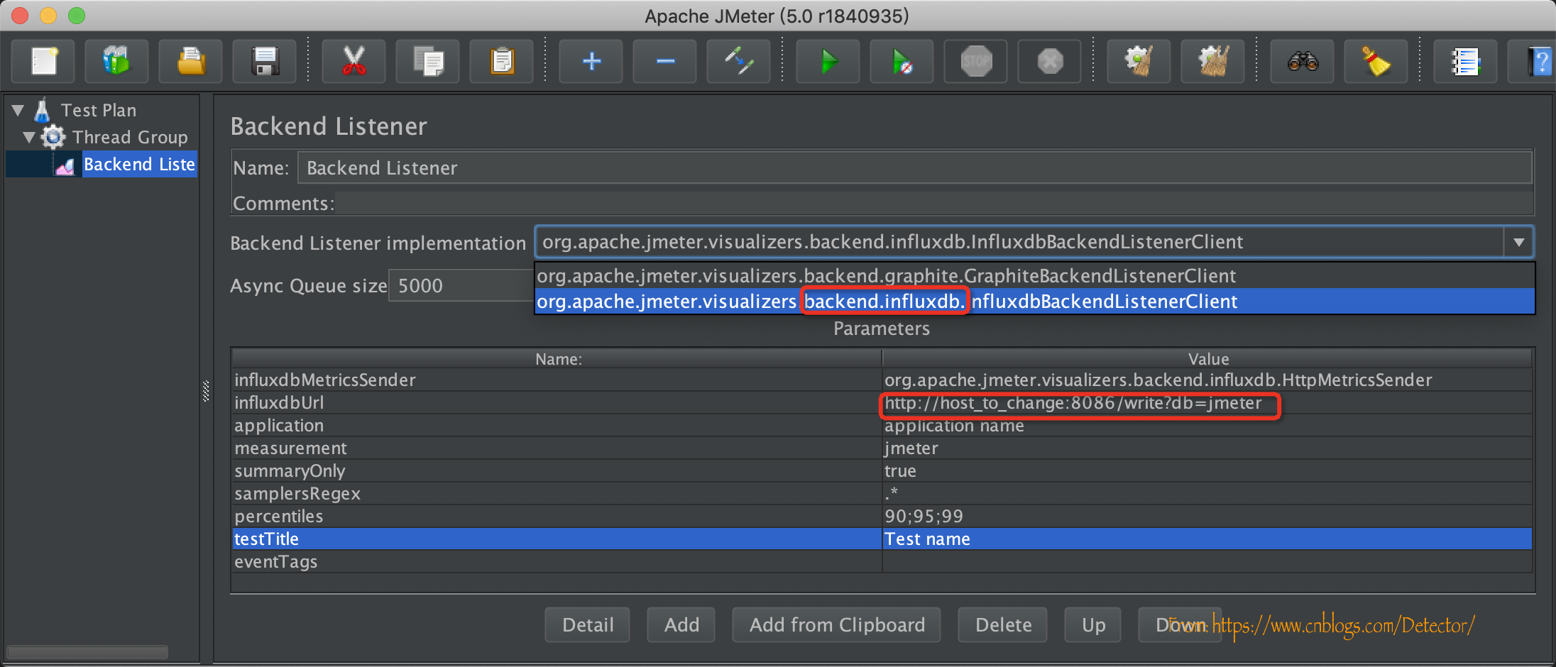 是不是很奇怪怎么说了那么久还是没有说到怎么配置Jmeter的监控?其实做完前面的事情,我们的测试环境就已经搭建完了,在接入数据库之前我们可以使用前面的方法在influxdb建一张叫Jmeter的表,然后在启动测试之前选择添加一个后端监听器,并选择为 influxdb ,数据库连接配置修改为我们搭建的真实host就可以运行测试了,数据都会写入Jmeter这张表,剩下的就是如何配置第一张图那样的花里胡哨的东西把它展示出来: