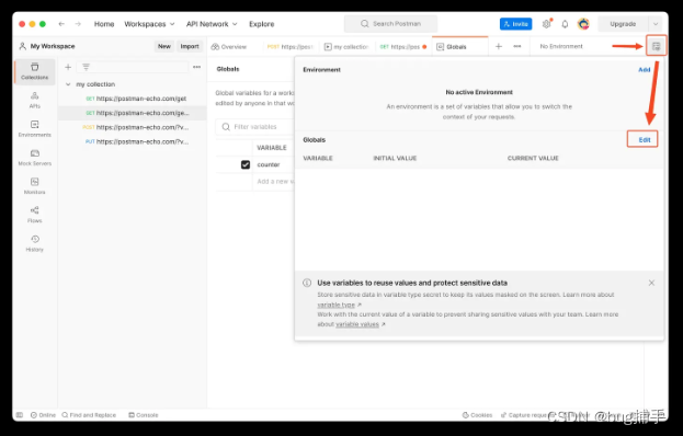 1、点击右上角的眼睛图标,找到 Globals 列的 Edit 按钮并点击。