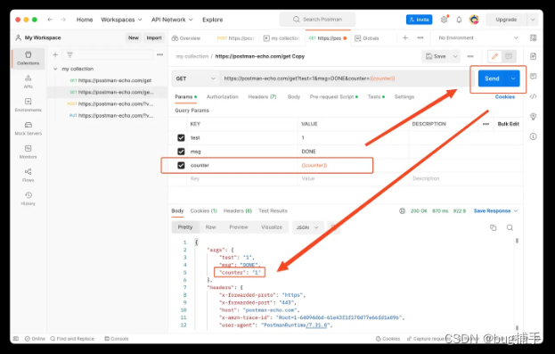 在 Params 处添加参数 counter,并将值设置为全局参数 {{counter}}。请注意,全局参数由双花括号 {{ }} 包裹。现在,我们可以点击 Send 按钮发送请求。此时,我们可以在结果中看到全局变量 counter 的值是 1。