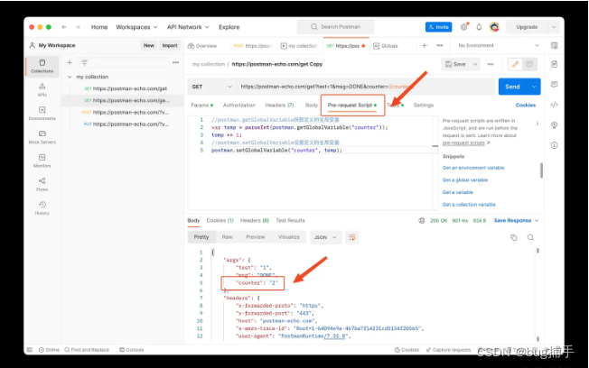 现在,我们需要将全局参数 counter 带入到请求参数中。这样,我们才能够在运行 API 测试脚本时,对全局参数进行自增操作。