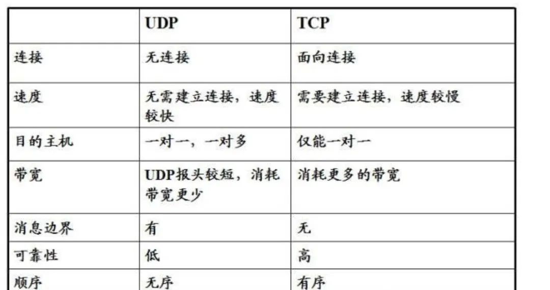 4.连接对象数量:TCP连接只能是点到点、一对一的,面向字节流。UDP支持一对一,一对多,多对一和多对多的交互通信,面向报文;