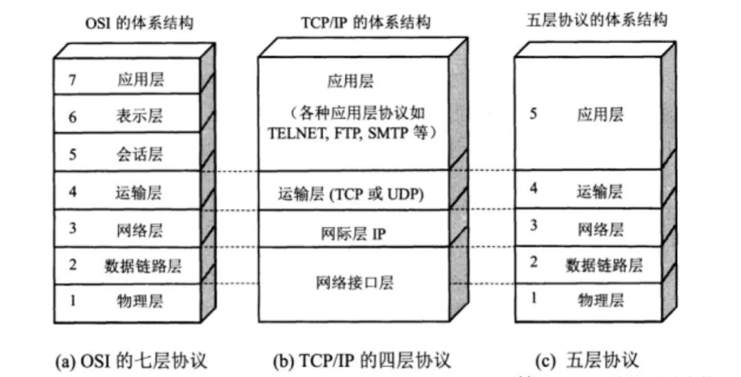 五层协议:应用层、传输层、网络层、数据链路层、物理层。