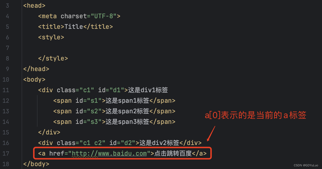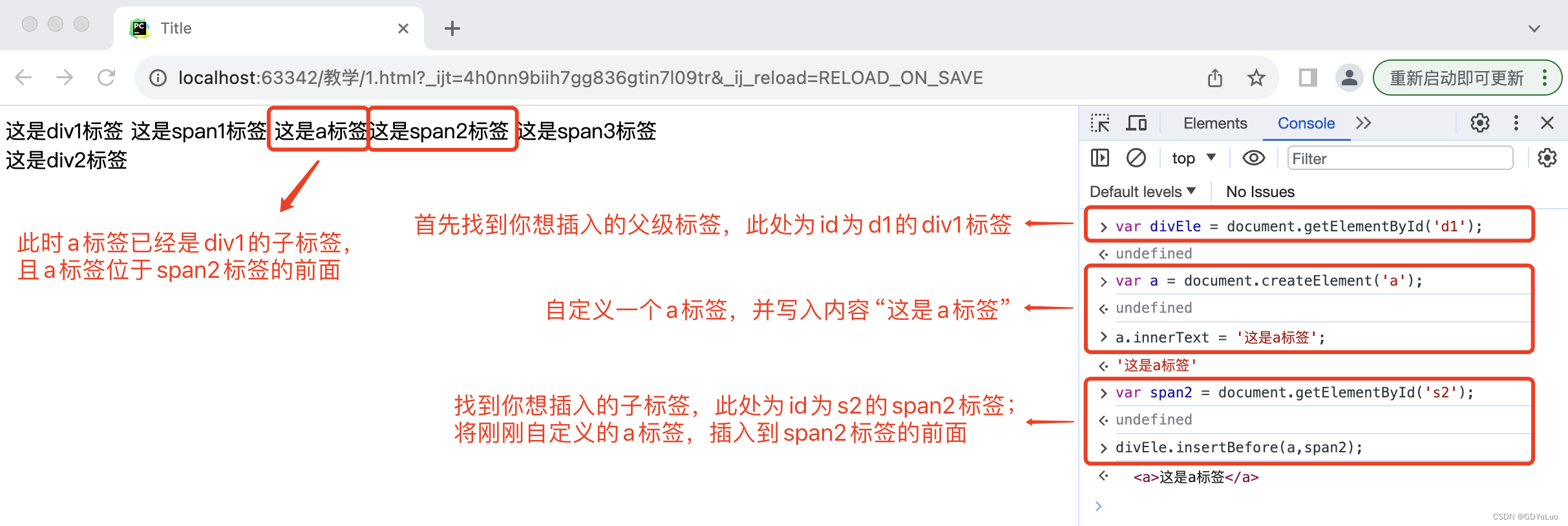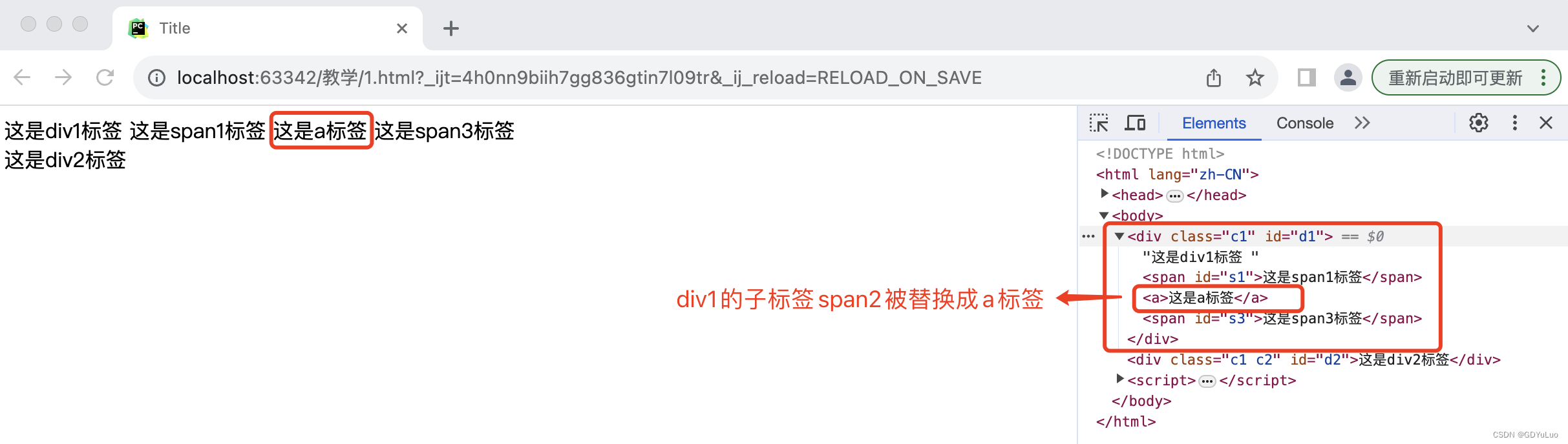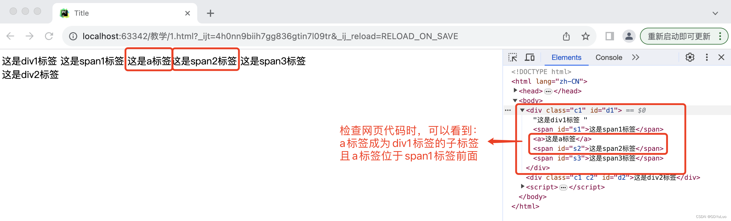 这样a标签及内容就会被插入d标签的子标签内部,并且位于d2子标签的前面。例如我们看下面这个案例,首先写好一个HTML文件,我想创建一个a标签,并把它插入到div1标签的子标签里,且要位于span2标签的前面