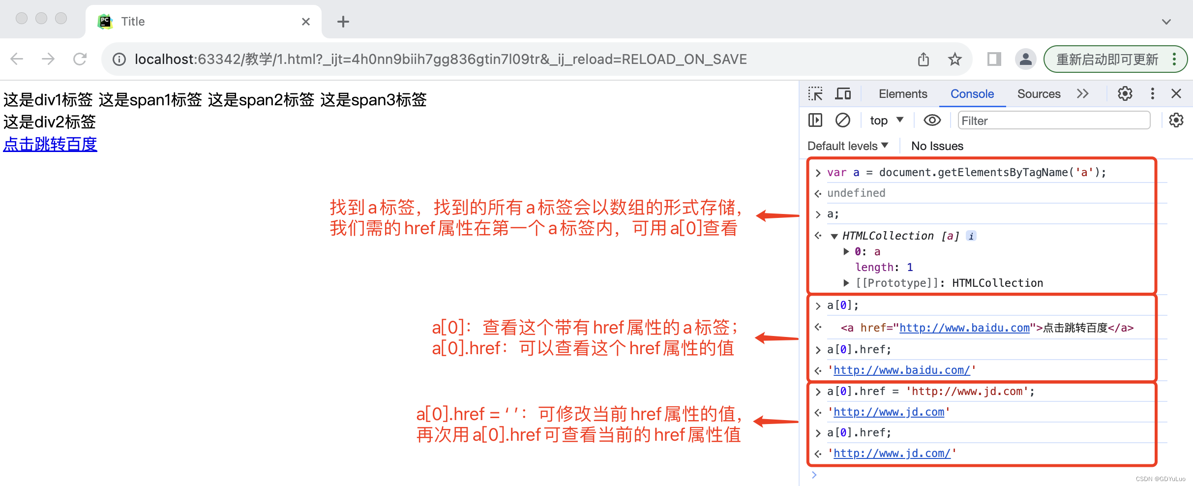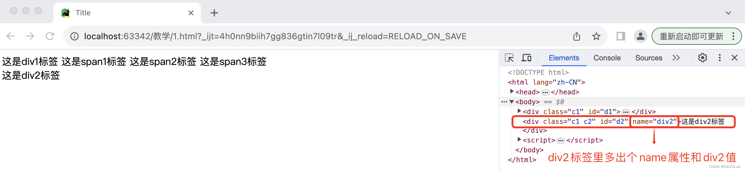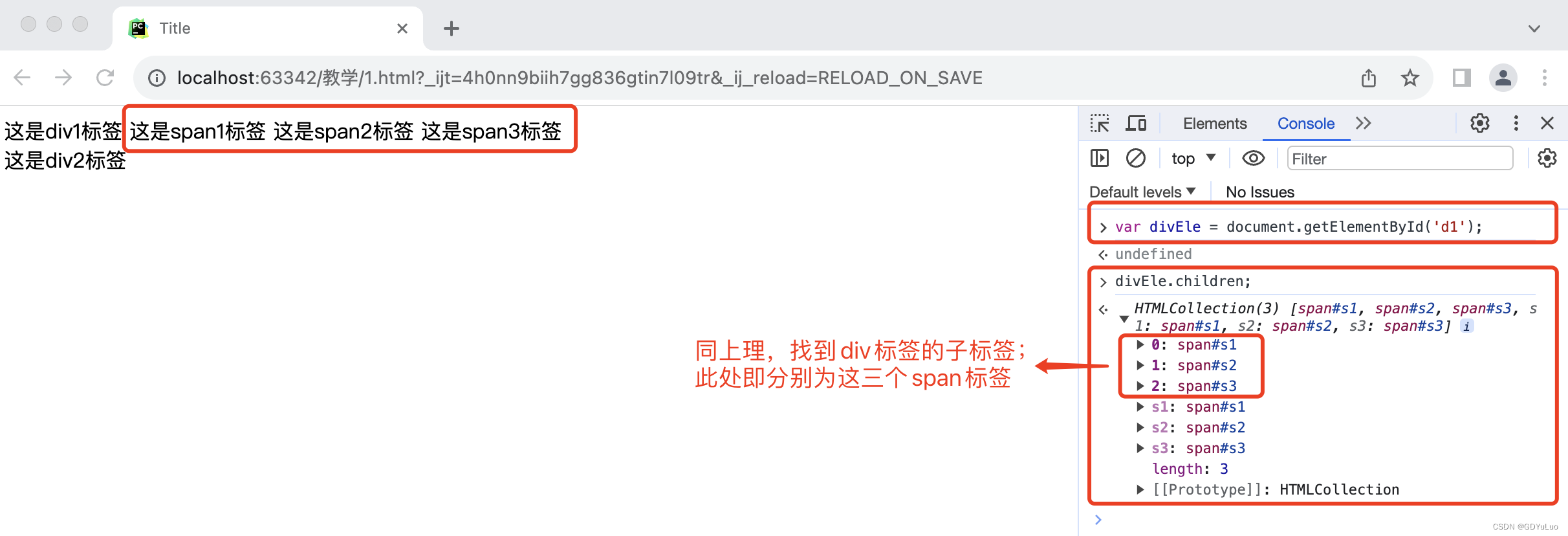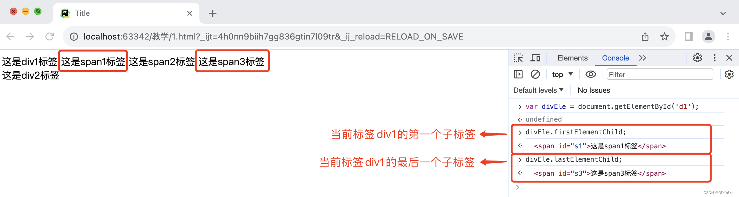 这样a标签及内容就会被插入d标签的子标签内部,并且位于d2子标签的前面。例如我们看下面这个案例,首先写好一个HTML文件,我想创建一个a标签,并把它插入到div1标签的子标签里,且要位于span2标签的前面