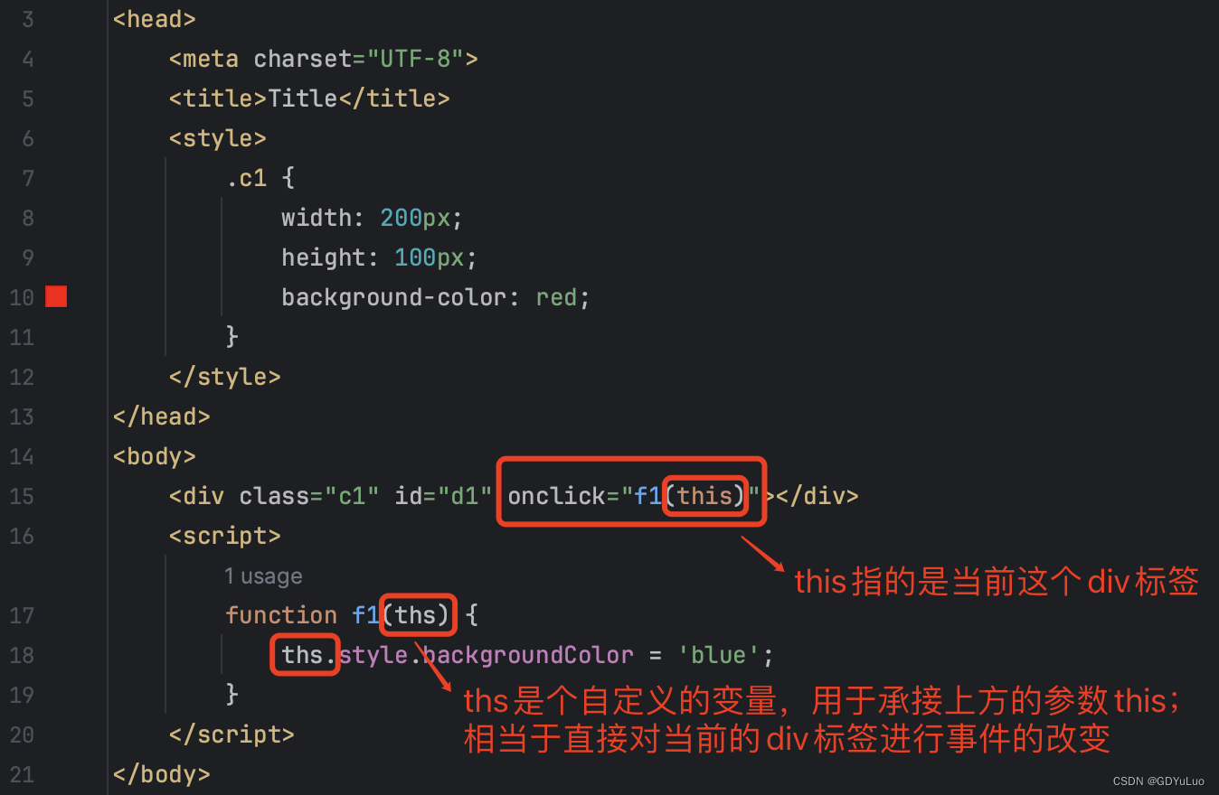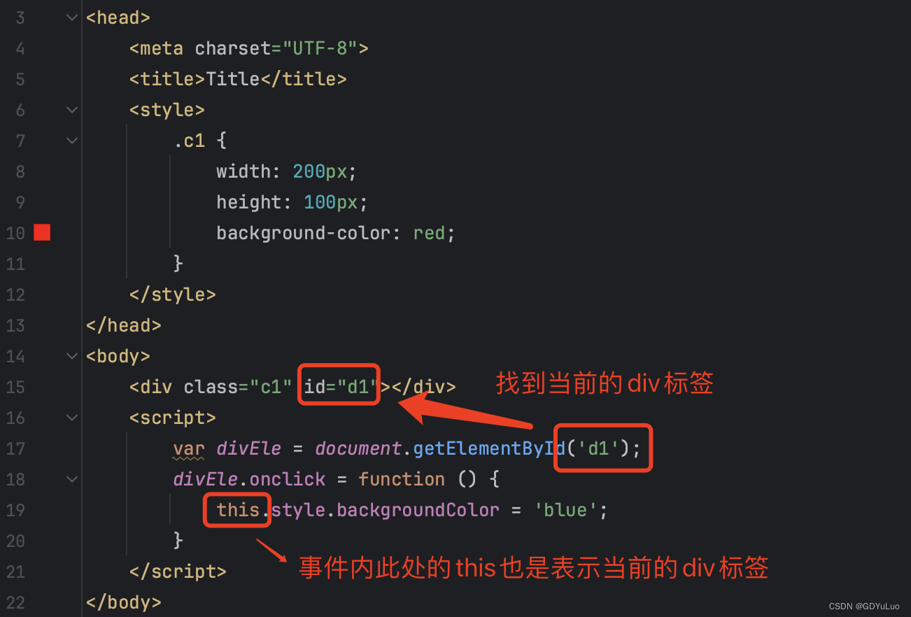 这种方式是找到当前的标签,进行事件的改变。因此我们也可以对这个函数添加参数this,因为这个onclick事件写在这个div标签内,所以这个this就表示当前的这个div标签,可直接对当前的div标签进行时间的改变,代码展示如下: