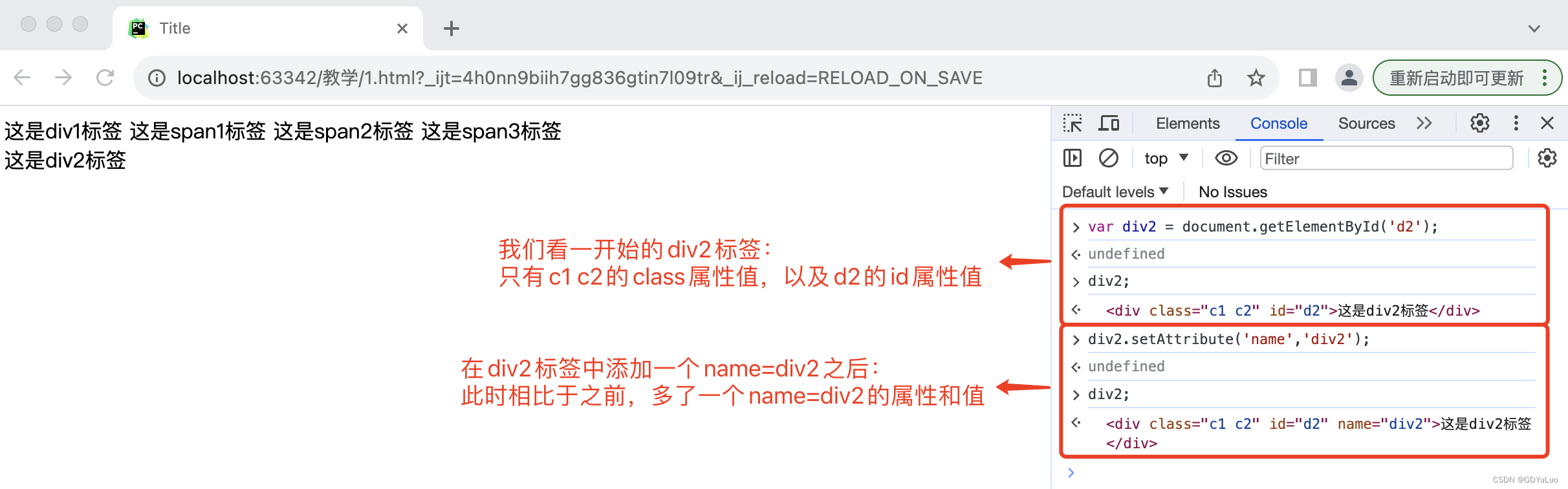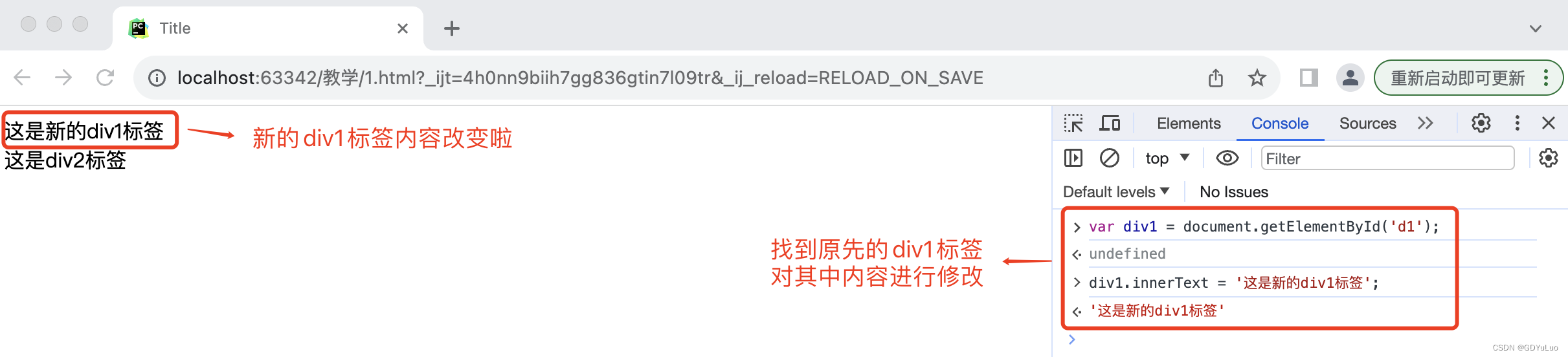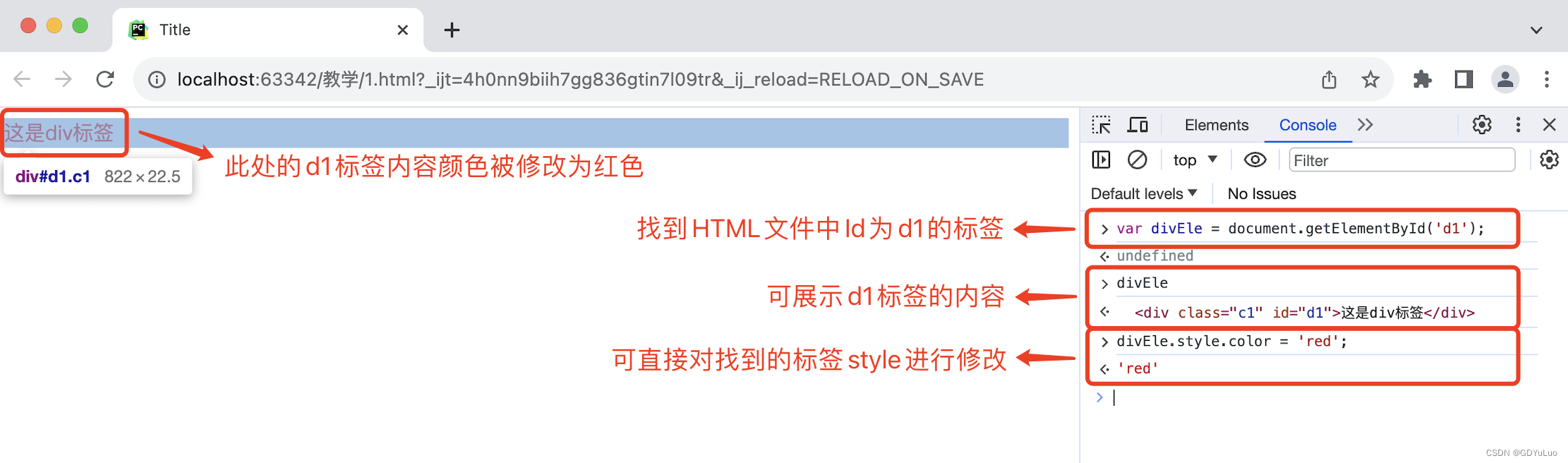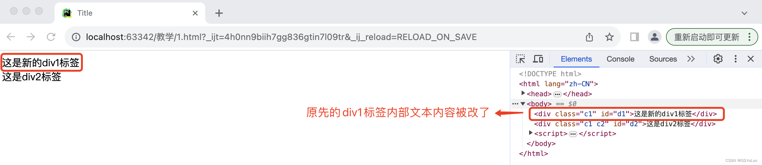 我们在HTML文件中写入一段代码,包含一个id属性为d1的div标签,在浏览器中利用如上的方法,找到这个div标签,并对其中的内容进行修改